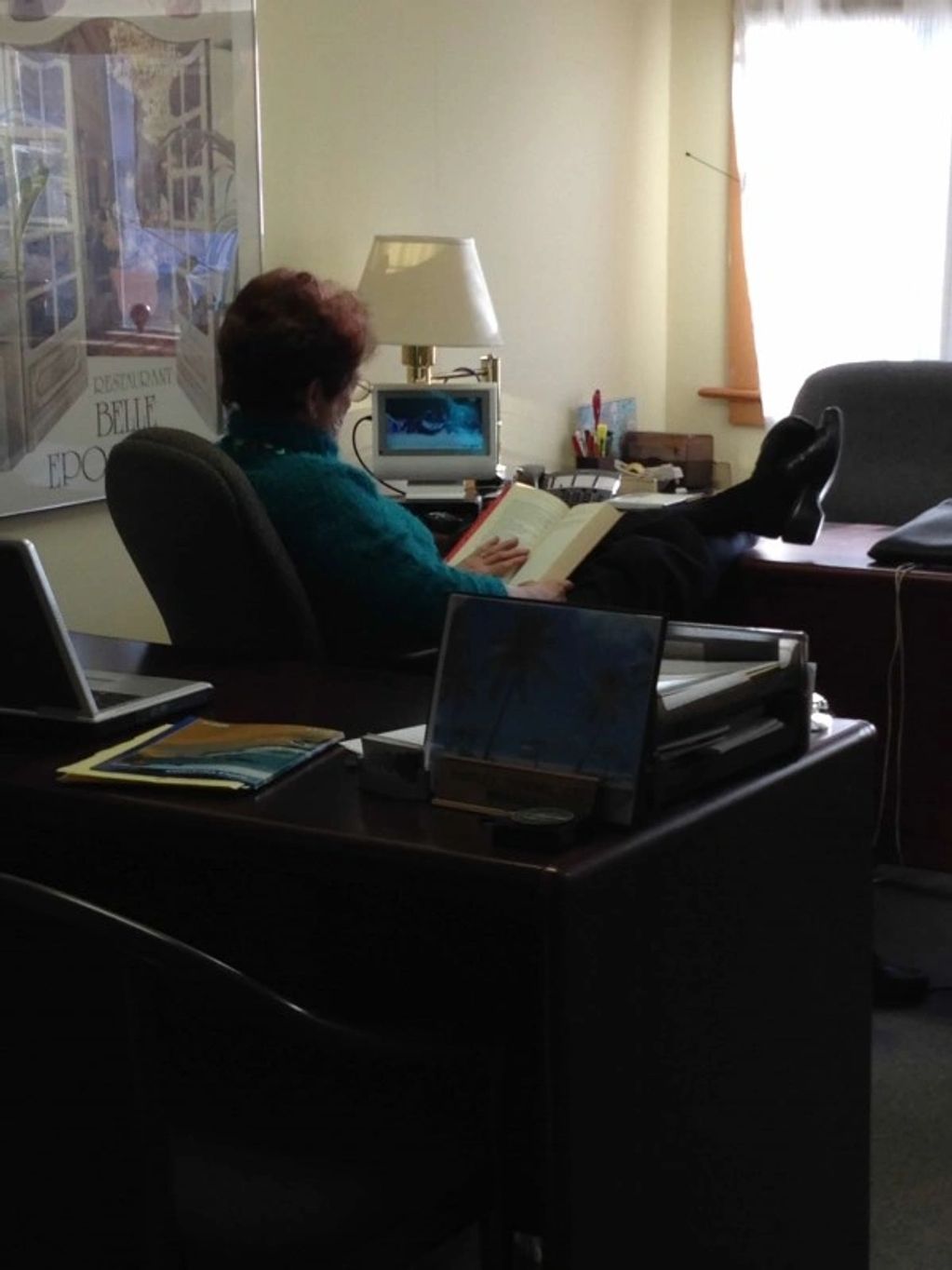 Shirley Thummel, Owner and Manager of Odyssey Travel, reading a book in between phone calls in her office. RIP Shirley. (2016)