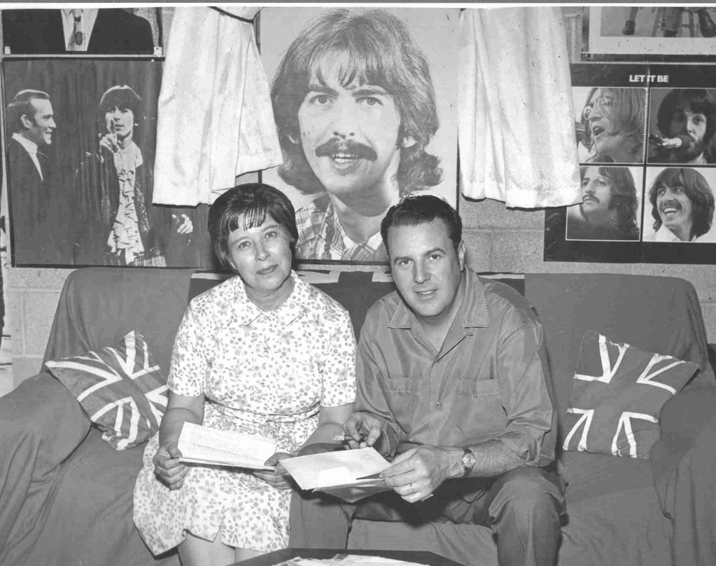 My parents in my fan club office reading the mail (1970) (taken by Collegeville Independent photographer)