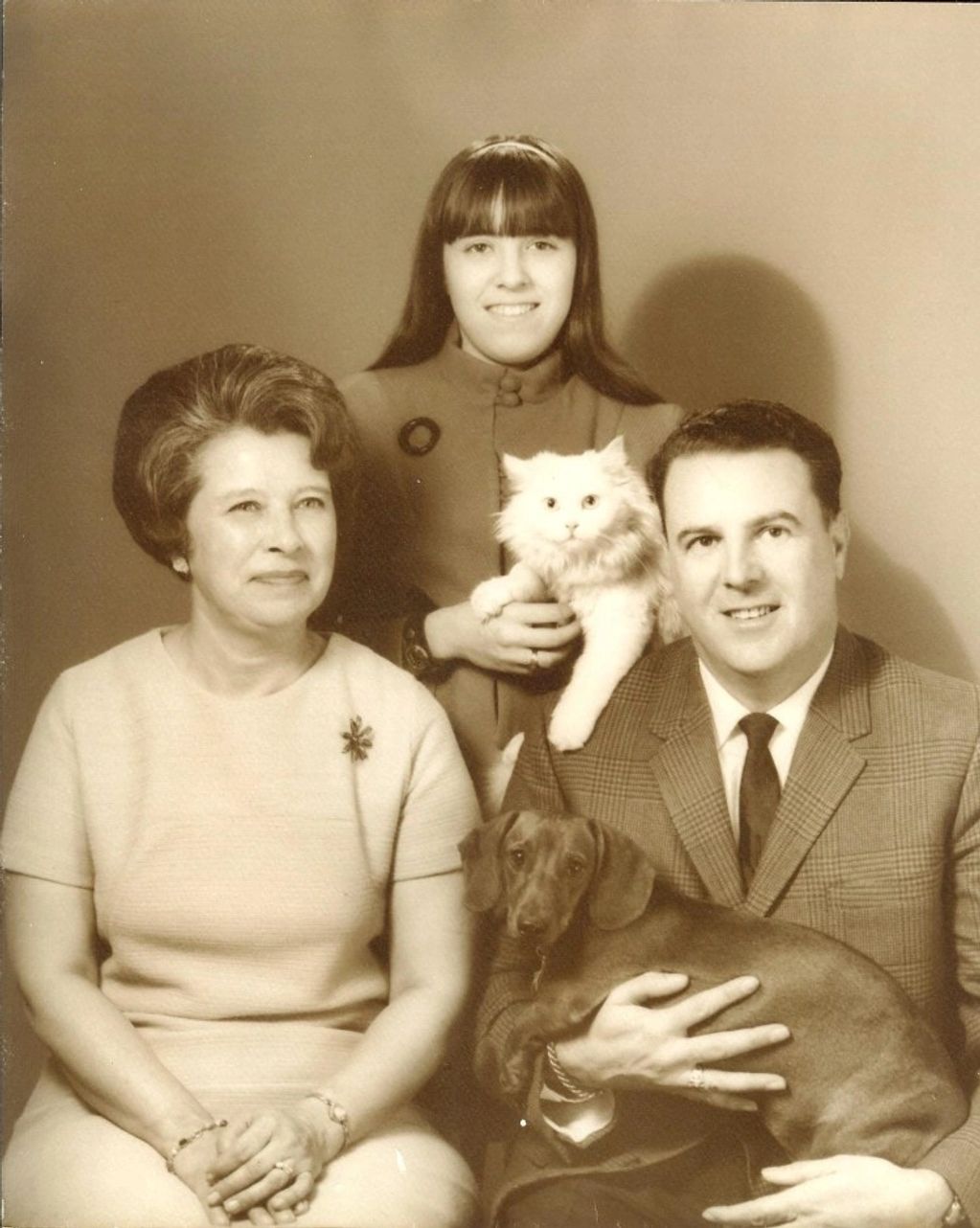 My parents and I with cat Korki and dog Heidi (1971) (taken by JC Penney photographer)
